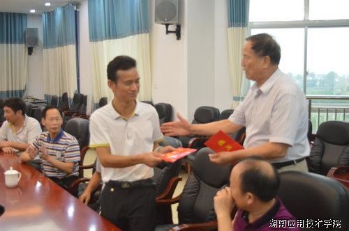在图书馆六楼会议室,何英满说明来意,随后分别将1万元和5000元现金送予病休的孟祥林老师和有病常服药的李承高老师。2位老师非常感谢,表示以实际行动治好病,好好工作,争作贡献。副院长夏维福代表学院讲话表示感谢,并表示下力关爱和稳定教师队伍,为建设民办本科名校出力。