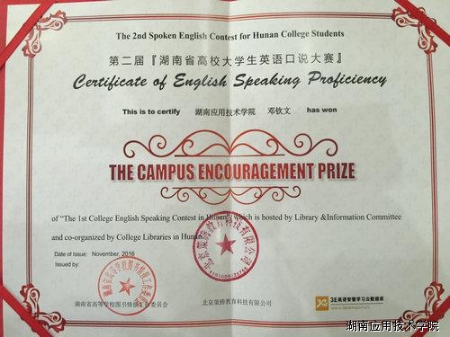 12月9日,在湖南大学召开了2016湖南省图书馆馆长年会,我校图书馆陈蓉老师参会,会上对第二届湖南省高校大学生英语口说大赛结果进行公布,我校外国语学院邓钦文同学获奖。