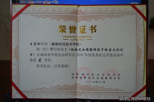 会议表彰了年度校园文化建设优秀论文、优秀校史馆、优秀校史书籍,我校校办负责人王富松撰写的《把校史的精髓植根于校园文化之中》获二等奖,学会向其颁发了荣誉证书。(校办)