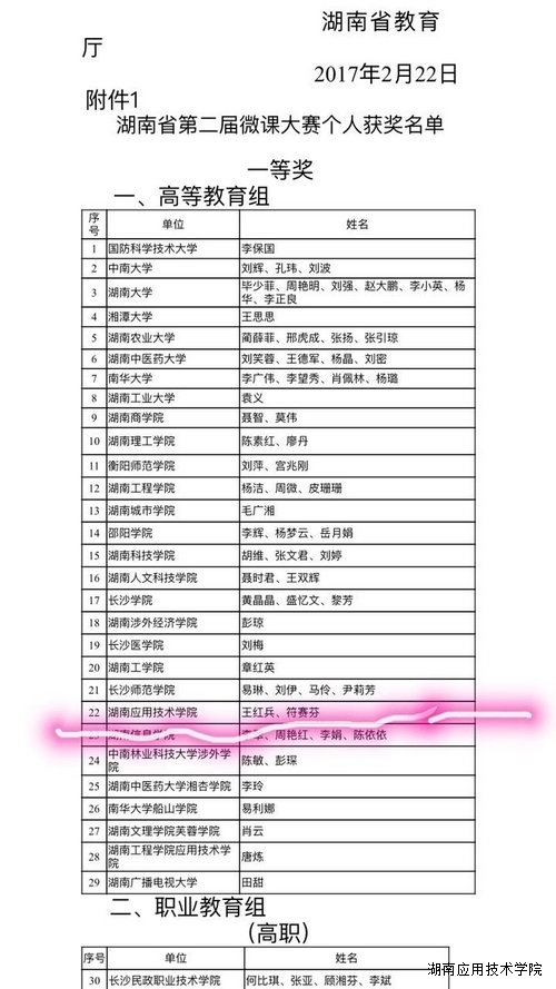 2月22日,省教育厅发出湖南省高校第二届微课比赛结果通报,我校设计艺术学院教师王红兵、符赛芬获一等奖,马妮获二等奖,汪奇文三等奖。全校领导和教师通过不同渠道向他们表示祝贺,并表示向他们学习,为学校增光添彩。(校办)