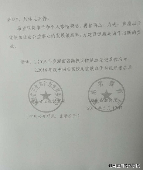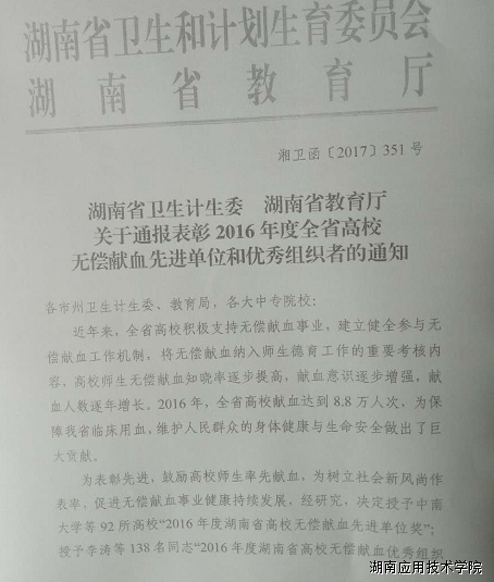5月31日,我校接收到5月17日省卫生计生委和省教育厅联合下发的湘卫函〔2017〕351号文《关于通报表彰2016年度全省高校无偿献血先进单位和优秀组织者的通知》。
