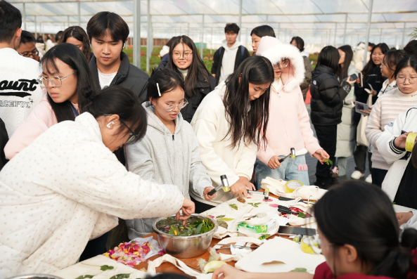 活动现场设置了多个特色主题游园,集观赏性、科普性与互动性于一体,有效丰富了校园文化生活,生动展现学校农林学科特色优势、实习实训基地建设成果与教学实践成效。在“鹃栖热林”科普展示区,师生认真研读植物标识牌与养护知识展板,深入了解植物特性;“鹃花谜语”环节中,师生积极参与互动答题,在趣味中深化认知;植物拓印体验区为师生提供创意手工平台,他们将叶片肌理拓印于帆布包、明信片上,实现自然与艺术的巧妙融合。