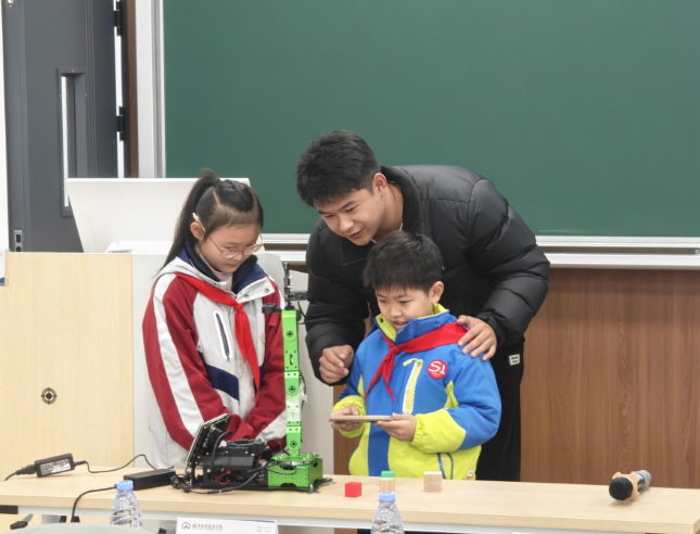 机器人协会精心筹备了科普课堂。课堂以机械臂与搬运机器人为核心内容,通过实物演示、原理拆解、互动体验、趣味问答等多元形式展开。志愿者详细讲解机械臂的关节构造、操控原理及精准作业流程,演示搬运机器人的智能协作机制;孩子们分组上手操作机械臂,体验精准抓取、搬运的全过程,在动手实践中感受科技的神奇与乐趣。问答环节中,孩子们踊跃举手提问,现场氛围热烈活跃,党员教师们陪伴引导,将雷锋“乐于奉献、乐于助人”的精神融入互动,鼓励孩子们主动探索、乐于分享知识。