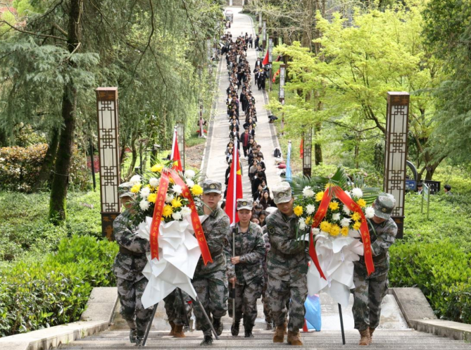 陵园内松柏苍翠、庄严肃穆。师生代表手持花束,整齐列队,经近两小时的步行,到达烈士陵园。他们庄严肃立,寄托对革命烈士的深切悼念和崇高敬意。学生代表在碑前深情诵读悼词,追忆先烈们为民族独立、人民解放抛头颅、洒热血的峥嵘岁月。