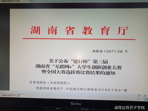 9月5日,根据收文《湘教通〔2017〕338号关于公布“建行杯”第三届湖南省“互联网+”大学生创新创业大赛暨全国大赛选拔赛比赛结果的通知》,我校在此次活动中获得2项奖励。