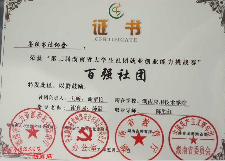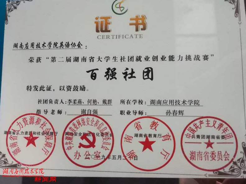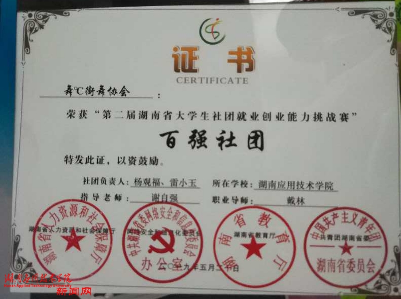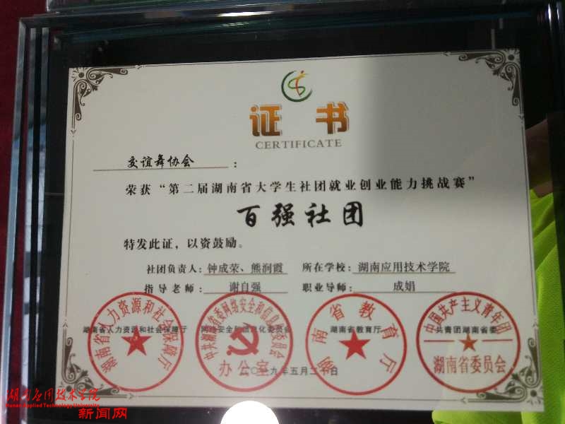 我校社团联合会以及各协会参加了此次百强挑战赛。在参赛过程中各协会积极的举办多姿多彩的社团活动,以提高社团活力和影响力,各类活动也取得了不错的效果。经过五十多天的网络投票角逐,我校墨缘书法协会、英语协会、舞"C街舞协会、交谊舞协会在湖南省众多竞争强大的大学社团里脱颖而出,获得“百强社团”称号,学校获评“最佳组织奖”。